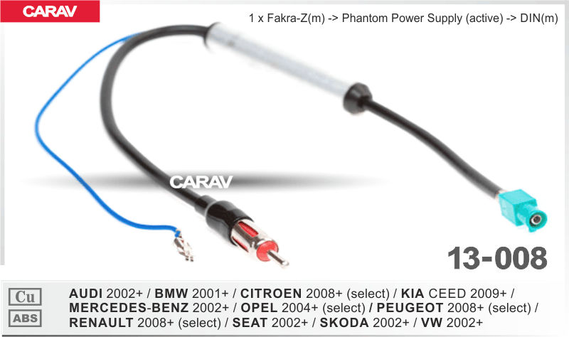 —Переходник для подключения штатной антенны к магнитоле CARAV 13-008: AUDI - MERCEDES-BENZ - SEAT - SKODA - VW 2002+ (all models) / BMW 2001+